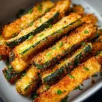 Delightful crispy zucchini fries made in an air fryer, coated with breadcrumbs and Parmesan cheese for a healthy snack or side dish.