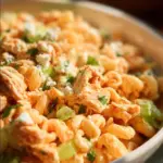 Buffalo Chicken Pasta Salad is a pasta dish that combines cooked pasta, shredded chicken, buffalo sauce, and ranch dressing, often garnished with cheese and veggies.