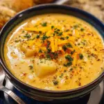 A warm and comforting potato soup infused with cheddar cheese, garlic, and fresh herbs, perfect for chilly evenings.