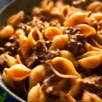 Creamy beef and shells is a comforting dish made with ground beef, pasta shells, diced tomatoes, beef broth, cream, and cheese, creating a rich and hearty meal.