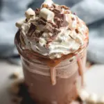 Enjoy a warm cup of decadent whipped hot chocolate, perfect for chilly days, featuring rich chocolate flavor and fluffy whipped cream.