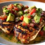 Grilled Chicken with Avocado Salsa is a delicious recipe that features marinated and grilled chicken breasts topped with a fresh salsa made of avocado, cherry tomatoes, red onion, cilantro, and lime juice.