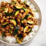 How do you make Healthy Ground Chicken and Zucchini Stir Fry? To make this stir fry, cook ground chicken in a skillet, add sliced zucchini and other vegetables, then season with garlic, ginger, and soy sauce for flavor.