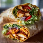 Now, lay your tortillas or wraps flat on a clean surface or plate. Start by adding a handful of chopped lettuce as your base. Follow up with slices of tomato, and if you’re using cheese and cucumber, sprinkle those on as well. The veggies add a nice crunch and freshness that balances out the richness of the chicken.