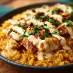 To make this dish, you marinate chicken with spices, layer it with rice and broth in an Instant Pot, and cook it before creating a creamy cheese sauce to drizzle on top.