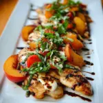 Once the chicken is grilled to perfection, it’s time to assemble your Peach Caprese dish. Place the grilled chicken onto a serving platter and layer fresh mozzarella slices evenly on top. Arrange the sliced peaches beautifully over the mozzarella, allowing their vibrant colors to shine. Finally, drizzle the balsamic reduction generously over everything, adding a stunning gloss to your arrangement. Finish it all off by sprinkling the chopped basil over the top, bringing a burst of freshness.