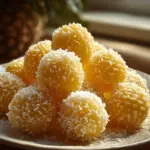 Pineapple Christmas Balls are bite-sized treats made from cream cheese, canned pineapple, powdered sugar, and shredded coconut, rolled into small balls for a delicious holiday snack.