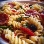 Pizza Pasta Salad is a refreshing dish that combines rotini pasta with classic pizza ingredients such as pepperoni, mozzarella cheese, cherry tomatoes, and olives, all tossed in Italian dressing.