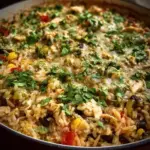 Salsa Verde Chicken & Rice Skillet is a one-pan meal featuring shredded rotisserie chicken, rice, black beans, corn, salsa verde, and spices, all cooked together for an easy and flavorful dish.