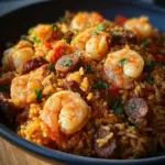 A vibrant Southern dish that combines smoky sausage, tender shrimp, and aromatic vegetables in fluffy rice, perfect for any gathering.