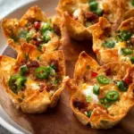 Spicy Jalapeño Popper Wonton Cups are bite-sized, crispy treats made from wonton wrappers filled with a delicious mixture of cream cheese, shredded cheddar cheese, diced jalapeños, and seasonings.